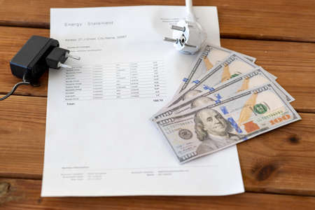 utility bill, money and electric plugs on table