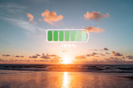 Fully charge battery 100% sign icon on natare summer beach on vacation day. Holiday long weekend relax time concept.