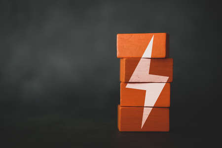 Wooden blocks with the battery charger icon. Close up