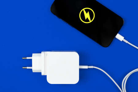 Lightning mobile charger. Smartphone with energy icon and power charger on blue background. Top view, flat lay