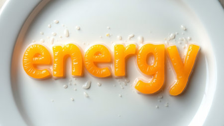 Vibrant energy word made of orange slices on white plate with juice droplets