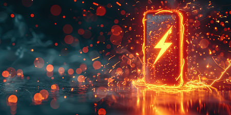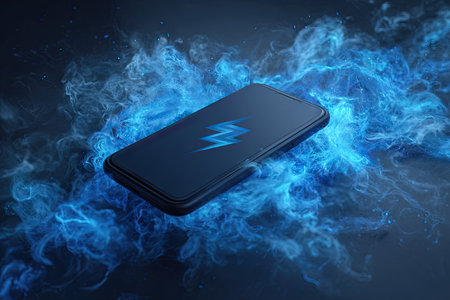 A smartphone rests within a swirling cloud of blue vapor, illuminated by focused lighting. The device features a prominent electric power symbol on its screen. The composition emphasizes dynamic energy, suggesting a technological or informational concept. Suitable for illustrating innovation or digital connectivity in diverse media.