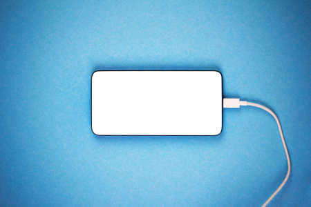 mock-up new smartphone with a white screen with a white charger wire on a blue background close up top view with a vignette
