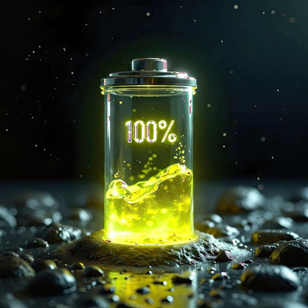 A glass container displays a glowing 100% battery icon with yellow fluid, set against a dark, speckled backdrop. The composition is likely digitally rendered, with high contrast lighting and a focus on detail. This image could be utilized for various commercial and editorial projects related to technology or energy.