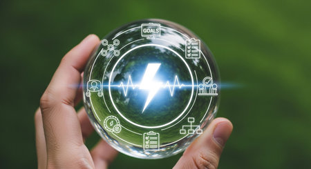 A hand delicately holds a crystal ball, within which a vibrant lightning bolt crackles, symbolizing energy and innovation. Icons of goals and planning surround it.