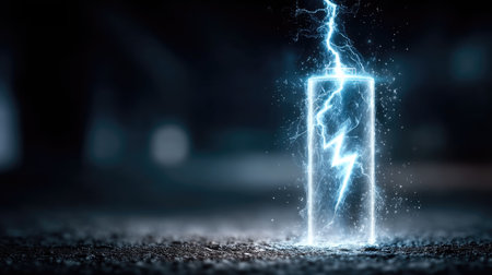 An illuminated rectangular pillar is depicted with electric energy flowing through it, generating a lightning effect. The image showcases a dark, blurred background and a shallow depth of field, highlighting the central object. The composition uses cool blue tones with a digital art style. It could be used in science, technology, or creative design projects.