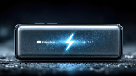 A close-up view presents a rectangular electronic gadget featuring a prominent blue lightning bolt icon. The dark, reflective surface reflects surrounding light, suggesting a sleek, modern design. The composition is clean and minimalist, with a shallow depth of field. Suitable for technology, energy or advertising applications.