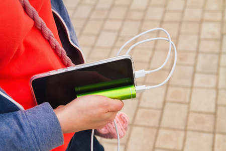 Man hands holding phone with charged battery on the screen connected to powerbank charge