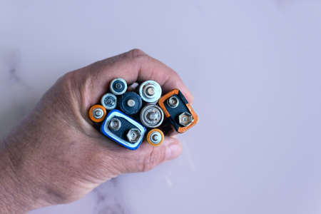 Close up of female hands holding used alkaline batteries heap. Disposal of old batteries and accumulator. Concept- recycling, disposable energy sources, power, environment and ecology.
