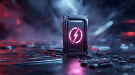 Neon lightning bolt symbol glowing on black futuristic device standing on high tech circuit board with blue and red lighting