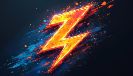 A striking lightning bolt graphic bursts with fiery orange and electric blue hues, set against a dark background. This dynamic image captures the essence of energy and power, making it perfect for projects that need a bold visual impact.