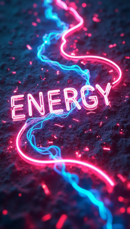A striking visual of the word ENERGY illuminated in neon blue and pink lights, creating a captivating glow against a textured dark background. The flowing lines of light evoke a sense of movement and vitality, symbolizing the dynamic essence of energy and creativity.