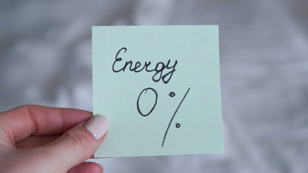 Close-up of a hand holding a green sticky note with handwritten text showing energy at zero percent
