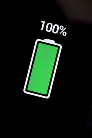 energy concept, full charged battery level indicator on a smartphone display.
