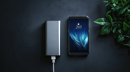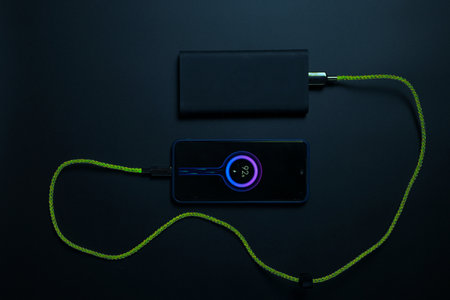 A black smartphone is charging with a power bank on a dark blue background.