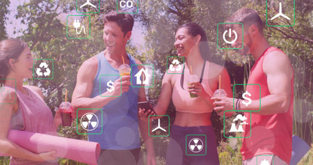 Standing four adults in sportswear holding cold drinks, phone and yoga mat with overlay icons. Outdoor, park, group, fitness, wellness, beverages, sunlight