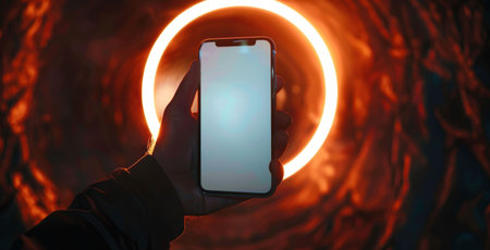 A hand holding a smartphone against a glowing orange circular light The phone s screen is blank, emphasizing the modern technology