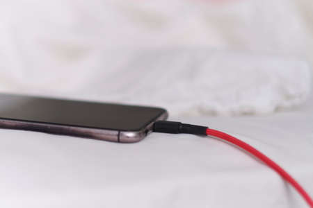 Smart phone is charging on the bed and lying on white fabric. Smart phone addict and Healthy lifestyle concept. USB Cable Connected With A White Mobile Phone