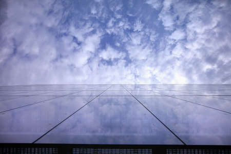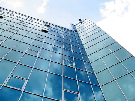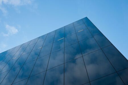 Modern glass office block window against sky with reflection