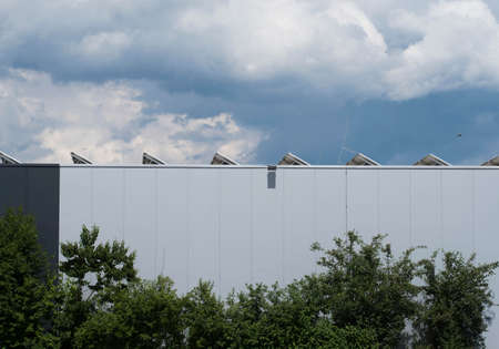 Solar panels on the roof of a modern office building. 3d rendering
