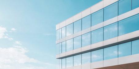A contemporary office building features sleek glass windows reflecting a clear blue sky. The architecture highlights the clean lines and modern design emphasizing the spacious feeling.