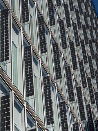 Modern eco-friendly office building with solar panels on the facade, reflecting the sun.