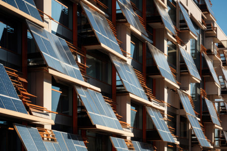 Low angle shot showcasing a building's modern architectural design with vertically mounted solar panels integrated into the facade, creating a sleek, sustainable look.