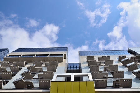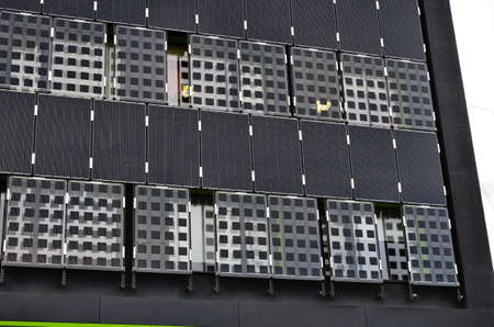 solar panels on the wall of a multi-storey building. Renewable solar energy.