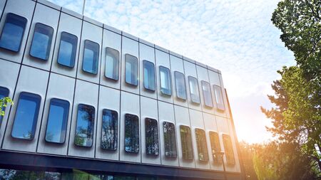Sun rays light effects on urban buildings. Abstract image of looking up at modern glass and concrete building. Architectural exterior detail of office building.