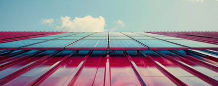 Solar panels on building. Modern building facade with integrated solar panels under a blue sky, showcasing sustainable architecture and renewable energy solutions.