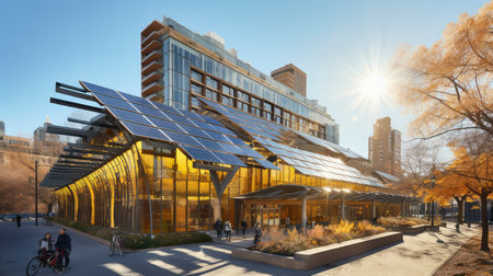 Sustainable public building with solar panels, generative AI
