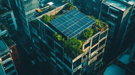 Urban real estate with a green roof and solar panels for sustainable living