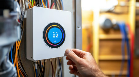 A person adjusts a smart thermostat in a modern home, showcasing technology and connectivity. The colorful display indicates temperature settings.