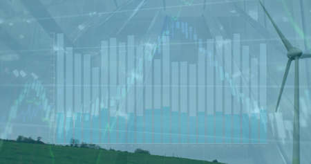 Image of graphs and financial data over wind turbine. finance, economy, renewable resources and energy concept digitally generated image.