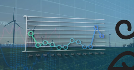 Displaying composite 3D line graph overlaying wind turbine farm, with colored monthly data nodes. Renewable, sustainability, technology, data visualization, environmental, clean energy, digital