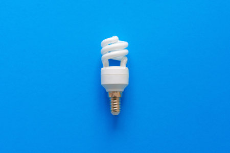 Spiral eco light bulb on a colored paper background. Top view. Minimalistic still life