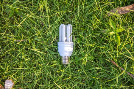 top view fluorescent lamps near paper card on green grass, energy efficiency concept