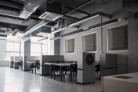 ventilation and exhaust system in modern office space, with sleek metal vents and stylish fans, created with generative ai