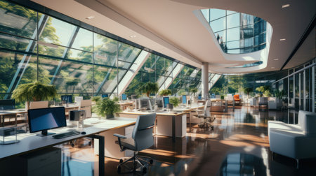 Modern office with sleek design and computer workstations in open layout. That the image is generated using AI.