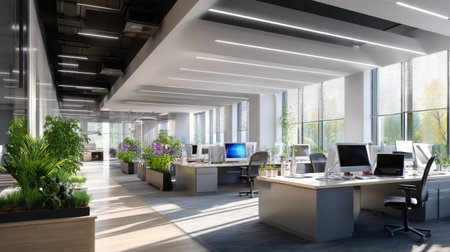 Modern open office with white desks and potted plants. That the image is generated using AI.