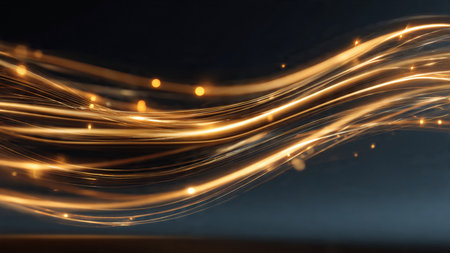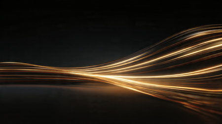 Dynamic, colorful light trails in wavy patterns against a dark gradient background.