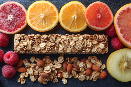 Close-up of a nutritious snack arrangement featuring sliced citrus fruits, an oat granola bar, raspberries, almonds, and oats on a slate surface. perfect for promoting healthy eating, breakfast recipes, or food presentations. Generative AI