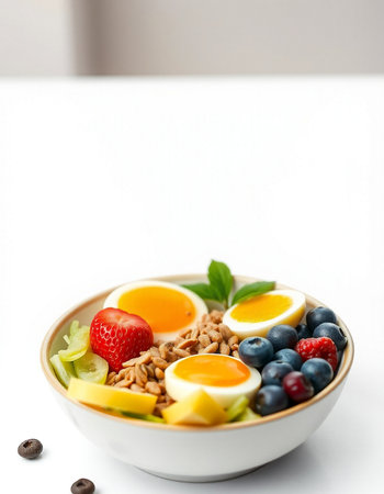 Healthy breakfast bowl with oatmeal, berries and egg on white background