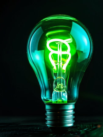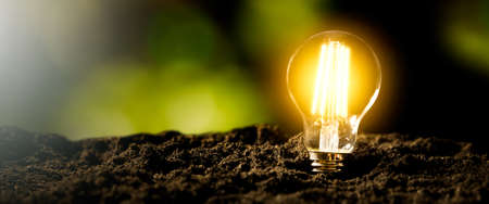 Incandescent light bulb on dark background. Green energy concept.