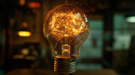 An individual's hand holds a glowing light bulb, the focal point against a blurred background. The image displays a mesh of light and sparks, with warm tones dominating. This suggests an idea of creativity and inspiration. It could be used for advertisements, presentations, or educational material.