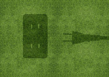 Green power cord in wall socket on grass background with copy space - eco or green power consumption concept, 3D illustration