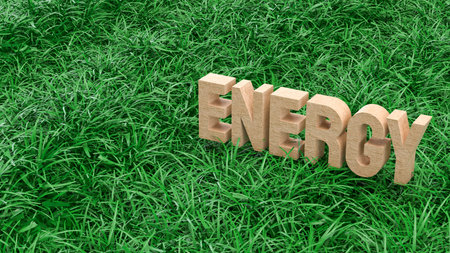 Wooden energy text standing on green grass representing renewable power sustainability clean environment eco friendly concept nature background for green business and environmental technology