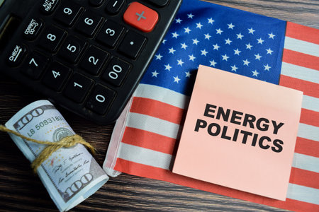 Concept of Energy politics write on sticky notes with United states flag and dollar currency isolated on Wooden Table.
