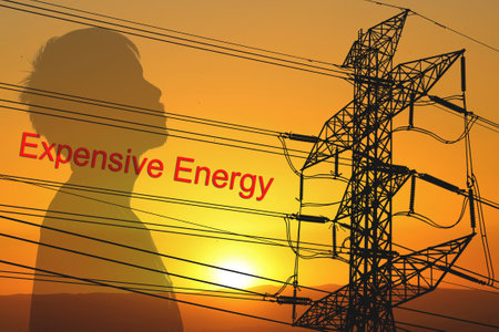 Silhouette of woman looking at electric tower and text ENGLISH ENERGY