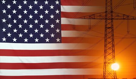 Concept Energy Distribution, Flag of USA with high voltage power pole during sunset